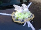 На бока или капот прикрепляют эмблемы из колец. Можно прикрепить на капоте и цветы, и флажки. Вверху, на крыше машины, укрепляют два переплетенных кольца, в каждом - колокольчик с привязанным к нему бантиком. Можно прикрепить к капоту два веночка из живых цветов, ягод, листьев, веток, украшенных бантиками, маленькими шариками, переплетя венки наподобие колец, протянуть вдоль капота ветку хмеля, цветочную гирлянду, зимой установить готовую корзиночку с искусственными цветами. Можно также вырезать из пенопласта аиста, несущего в клюве какой-либо свадебный символ, укрепит его над крышей автомобиля.